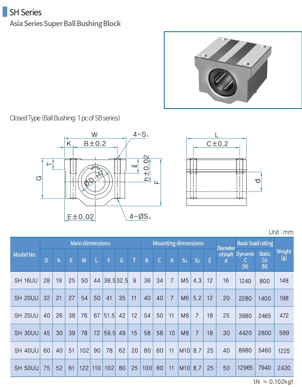 There is an SH series with one SB bushing assembled, and an SHW series with two assembled in series.