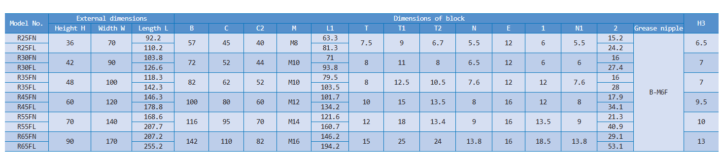 – This linear motion guide features tapped holes on the block’s flange, allowing for versatile mounting in both upward and downward directions.