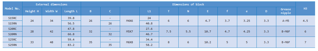 – This is a slim, compact block that shares the same cross-section as the S-RC series, minimizing the width and height of the linear motion block.